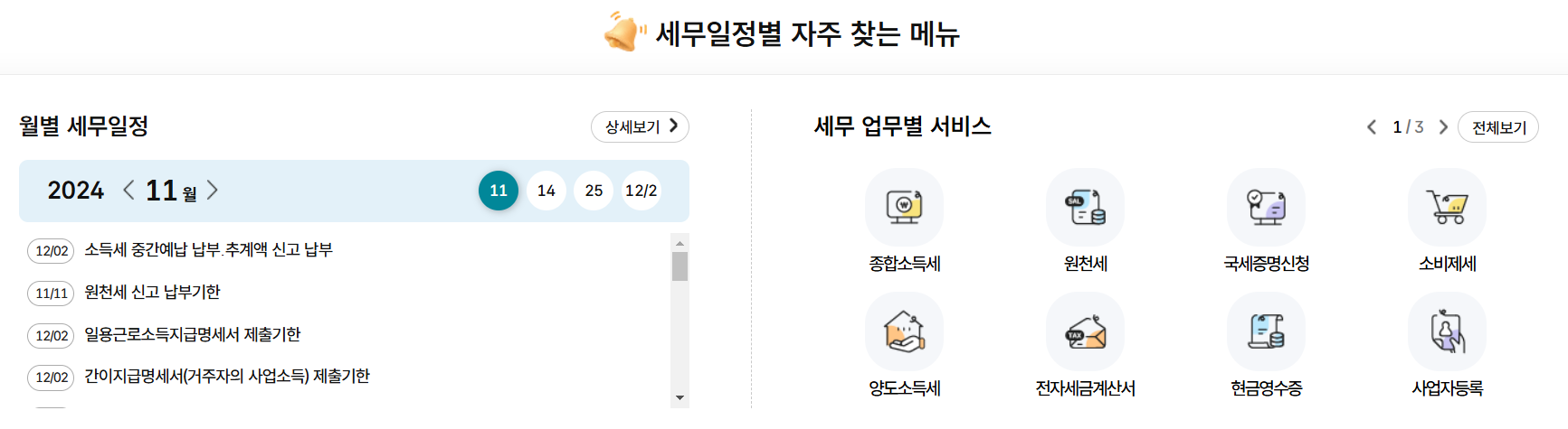 접속한 후 로그인합니다. 이후 메인 화면에서 "국세증명" 메뉴로 이동한 뒤, "소득금액증명"을 선택합니다.